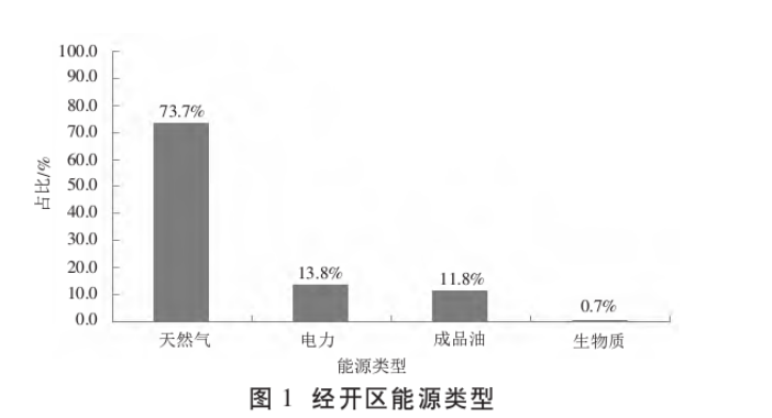 經開區主要能源類型為天然氣(占73.7%)、電力 (占13.8%)、成品油(占11.8%)和少量的生物質能(占 0.7%)。主要用能領域包括工業生產用能,交通運輸用能,居民、商業生活用能及冬季供熱用能。工業用地以白酒釀造、包裝彩印為主要產業,用能以天然氣、電力為主;公服、商業用地以及居住用地用能以電力、天然氣為主。經開區能源類型如圖1所示。