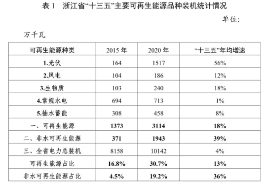 "十三五"以來,我省高度重視可再生能源發展,并取得顯著成績。截至 2020 年底,全省可再生能源裝機容量達到 3114 萬千瓦,其中光伏1517萬千瓦(分布式 1070 萬千瓦),常規水電 713 萬千瓦,抽水蓄能 458萬千瓦,生物質發電 240萬千瓦(垃圾發電 210 萬千瓦),風電 186 萬千瓦(海上風電 45 萬千瓦),可再生能源裝機占比達到 30.7%。