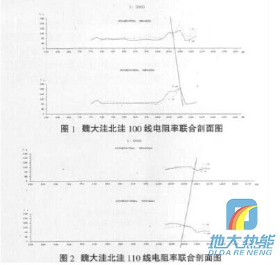 (1)魏大洼100線電阻率聯合剖面沿東西向布設。當AO= BO=70m,聯剖曲線ρsA與ρsB兩線在1010點處為正交點; 改變極距、AO=BO=130m后, 聯剖曲線ρsA與ρsB兩線在1020點處為正交點;說明該地層構造產狀較陡并向東傾斜。向南100米與100線平行布置110線,當AO=BO=70m,聯剖曲線ρsA與ρsB兩線在1105點處為正交點;改變極距、AO=BO=130m后,聯剖曲線ρsA與ρsB兩線在1110點處為正交點;說明該地層構造近似南北向(見圖1~2)。