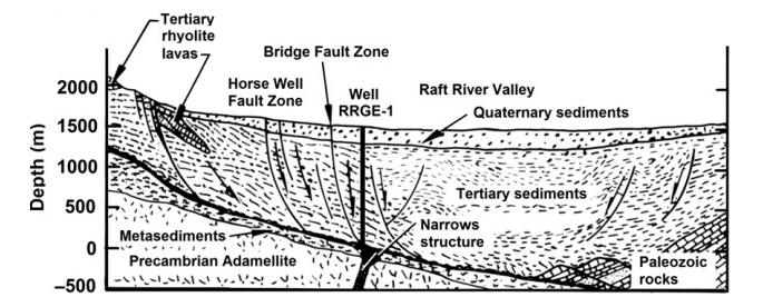 拉夫特河地熱田的熱儲層,處在一個盆地中,這個盆地西部以一個小角度的斷層為界限,東邊則是由黑松山(Black Pine Mountains)和一個二次斷層分界。熱儲的蓋層為第三系的沉積層,基底巖石大約厚度為1600m,在這個深度被一個東北向的線性構造—解理構造(Narrows Structure)所貫穿,人們認為這個結構是基底剪切作用產生的。熱源為前寒武紀二長花崗巖。開始,人們認為熱液是通解理構造涌上來,然后通過其他的褶皺和斷層蔓延整個沉積構造。現在的人們則認為有兩個熱源補給區,一個來自西北方向沿著馬井斷層分布的補給區,另外一個則是來自東南方向的,可能是與變窄構造有關聯。